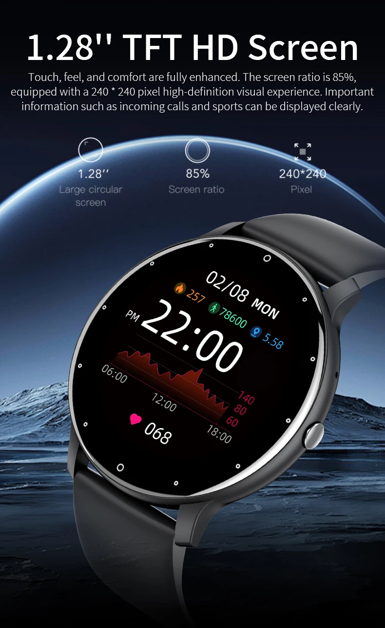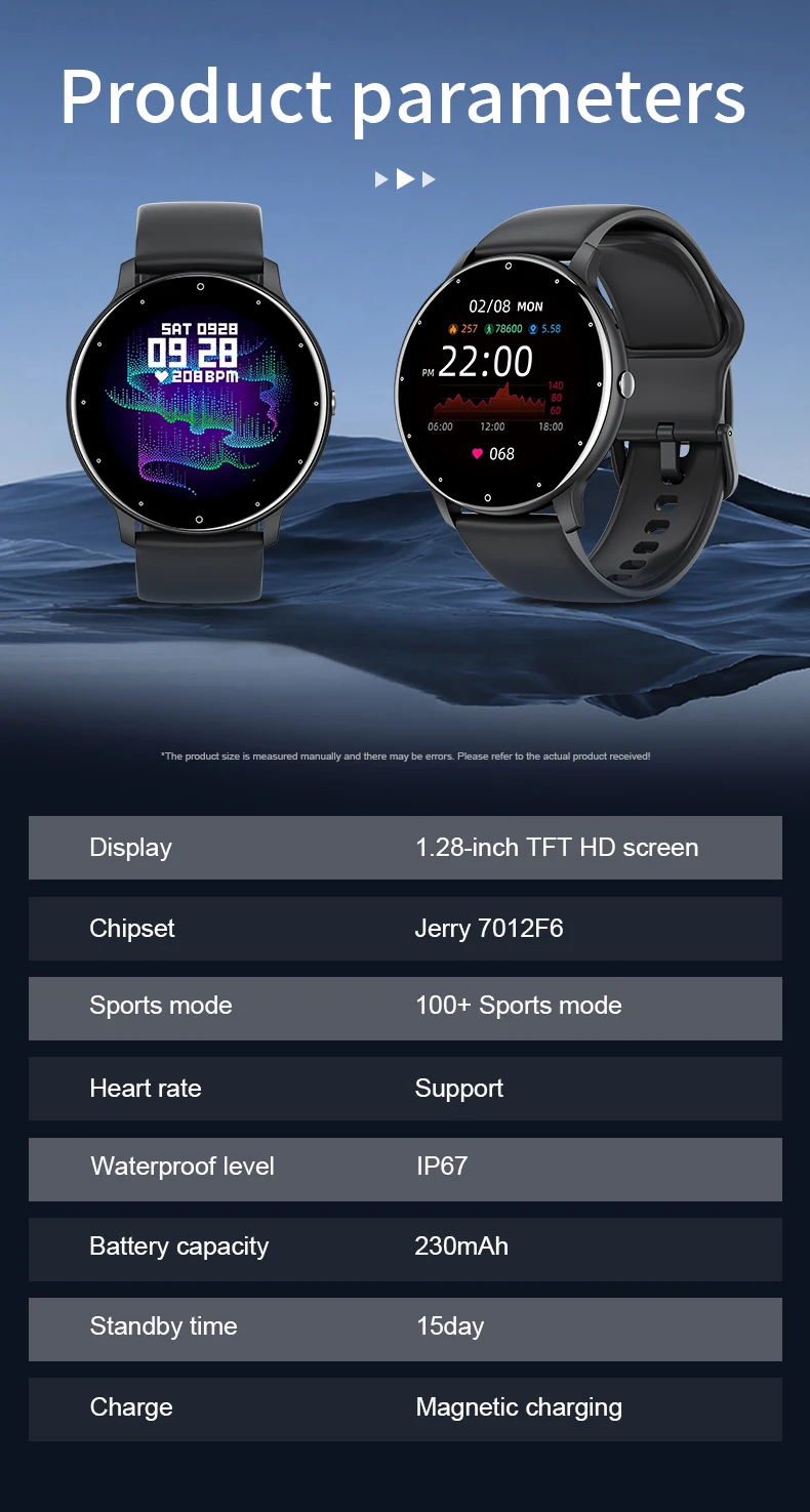 - Large HD display, Bluetooth calling, rotary button, NFC, magnetic charging, large number dials, multiple sports health monitoring