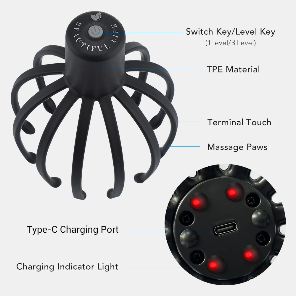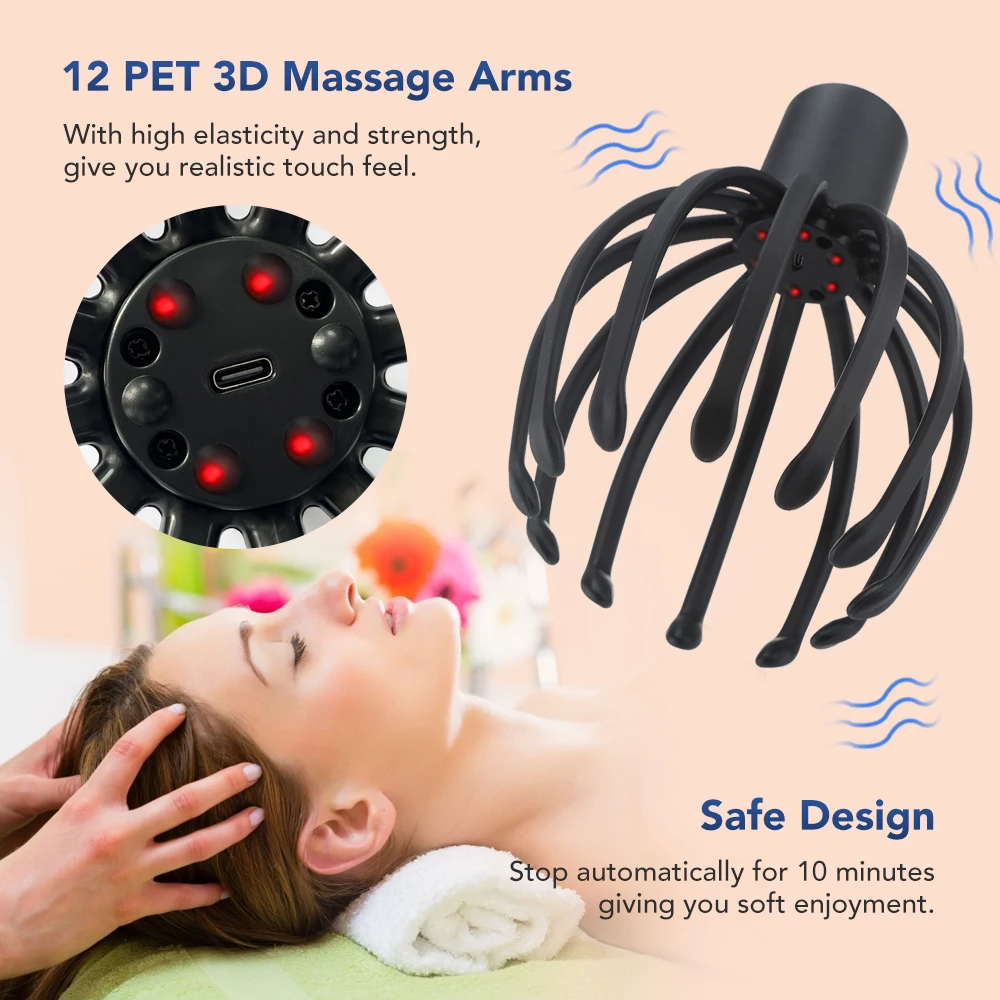 - The scalp massager is designed with 12 fingertip-like nodes, simulating human touch, transmitting multi-frequency vibration around the head, and stimulating scalp nerves point-to-point